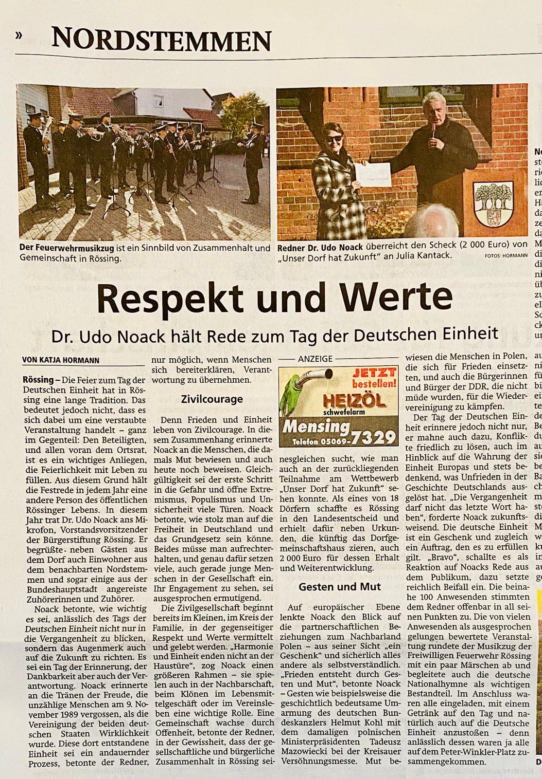 Der diesjährige Redner zum Feiertag der deutschen Einheit war der Vorstandsvorsitzende der Bürgerstiftung Rössing Dr. Udo Noack.