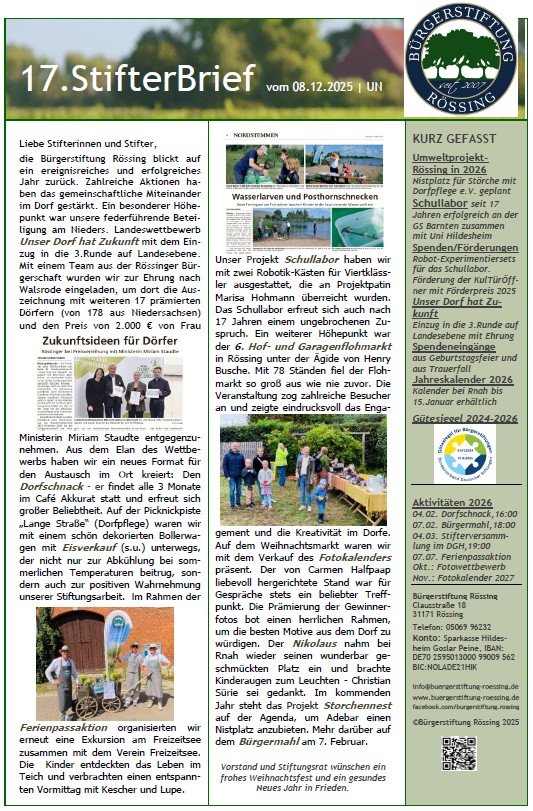 Der regionale Wettbewerb im Landkreis Unser Dorf hat Zukunft, die erneute Verleihung des Gütesiegels für Bürgerstiftungen, die Förderung von Brandschutzerziehung, Umweltprojekten und Wappenbaum, das 50. Gemeindejubiläum, das Schullabor, das Heersumer Sommertheater, der Fotokalender und eine Spende der KWG an die Bürgerstiftung waren Themen im Jahr 2025 für die Bürgerstiftung Rössing.